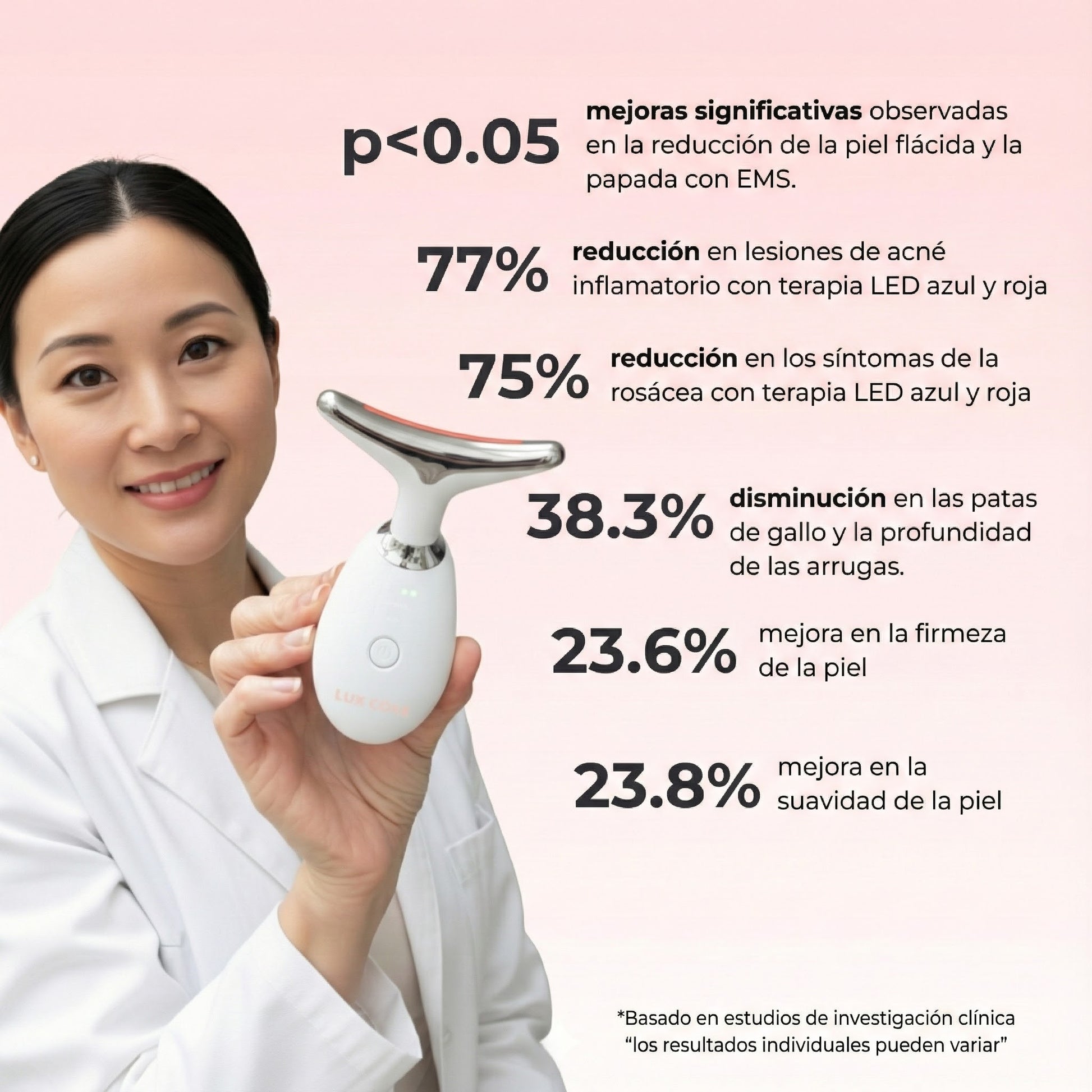 * Basado en un estudio independiente de validación realizado a 60 personas durante 30 días utilizando el LED Face Sculptor 7-en-1. Los resultados pueden variar.