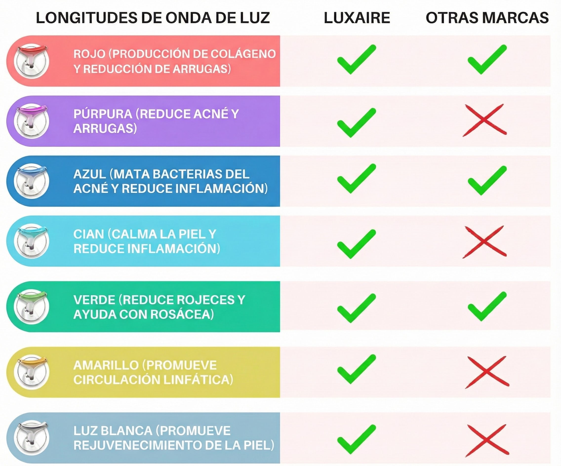 Elige entre 7 luces LED, clínicamente comprobadas para mejorar la textura de la piel, reducir arrugas, combatir el acné y mucho más.