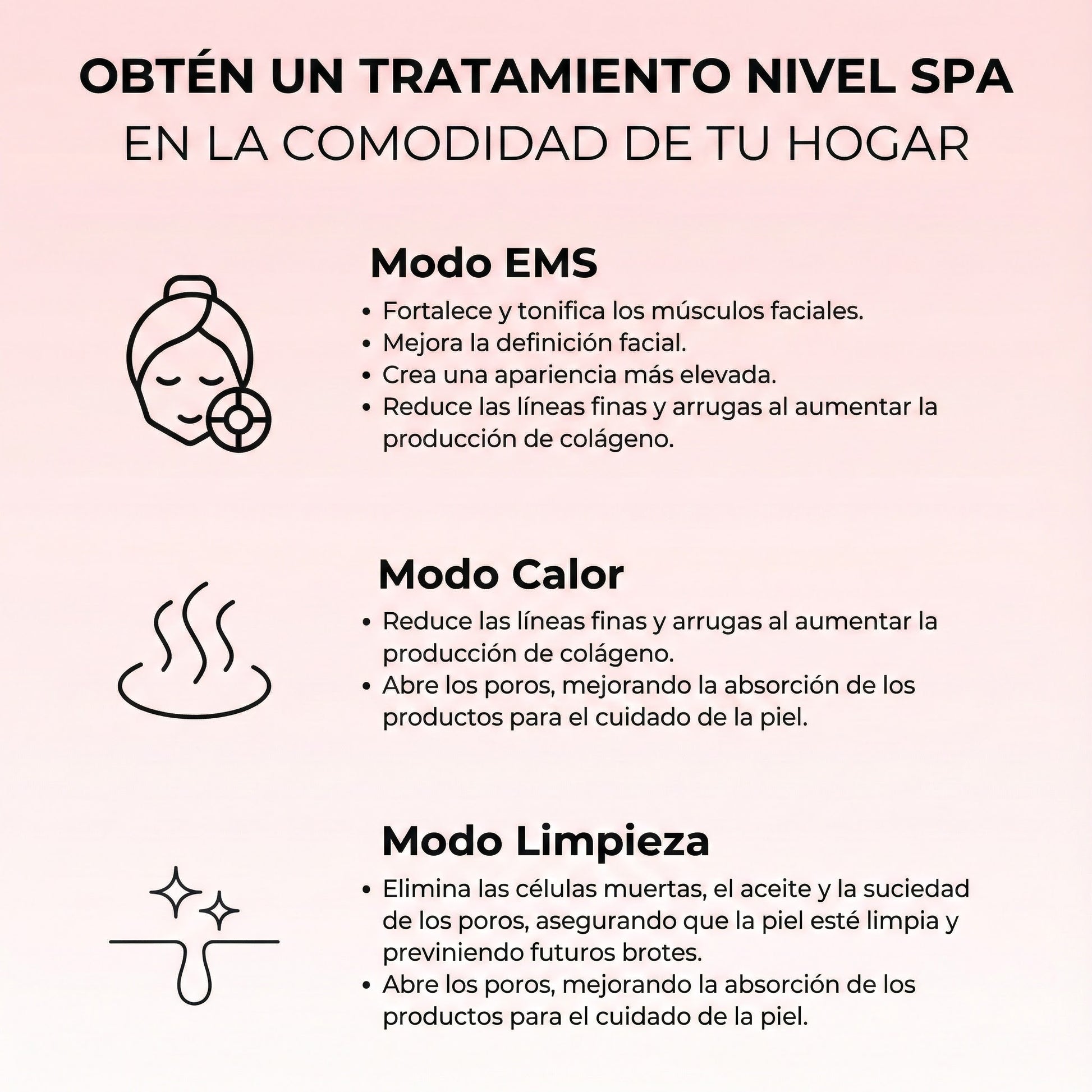 EMS Mode que aplica microcorrientes para tonificar y reafirmar el rostro.